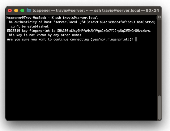 Whenever you log into a computer for the first time, OpenSSH will show you this message. You can type yes to verify that it’s okay to proceed. You shouldn’t see this message again after the first time you log in from the same Mac. If you do, it could be a sign that someone has re-installed the OS on the remote computer—or it could be that the remote computer is an imposter. If you’re logging into your own computer and see this message again (and you haven’t reinstalled Linux), then something is definitely wrong. Keep in mind you’ll see the message for every new Mac that you use to log into your server.