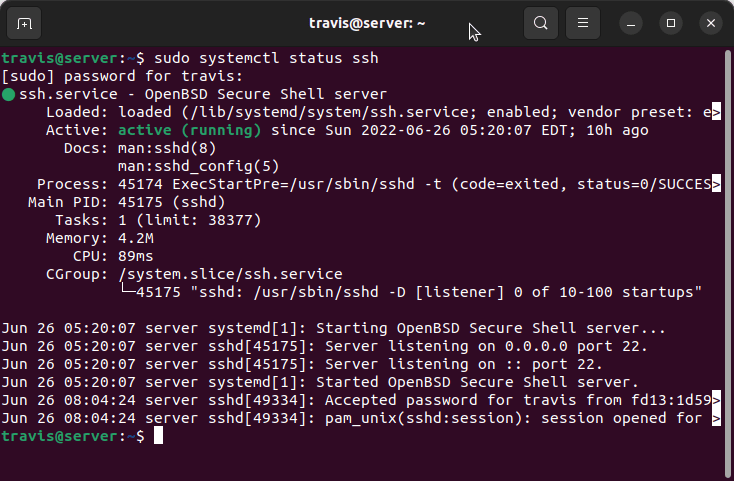 travis@server:/home/travis$ sudo systemctl status ssh
